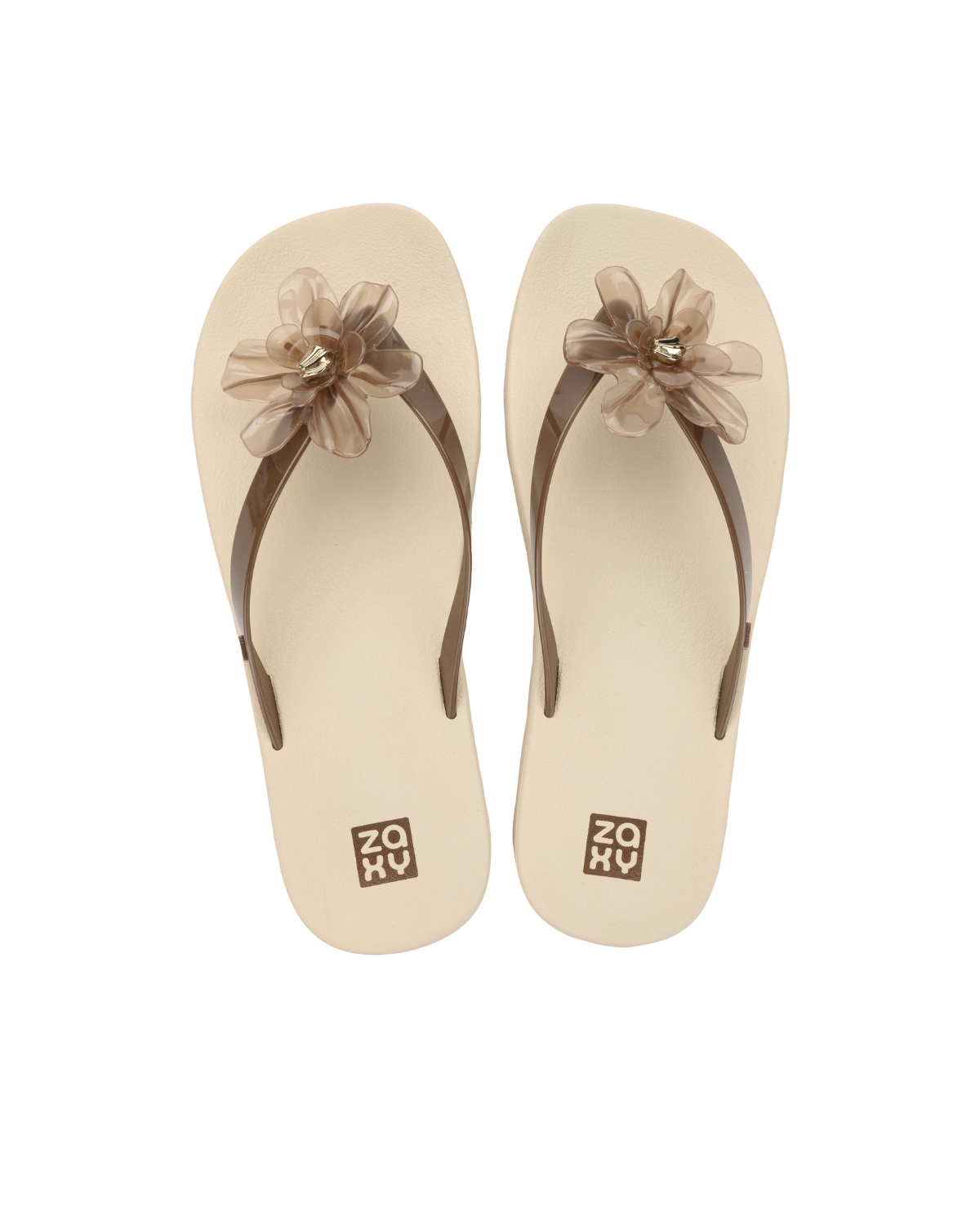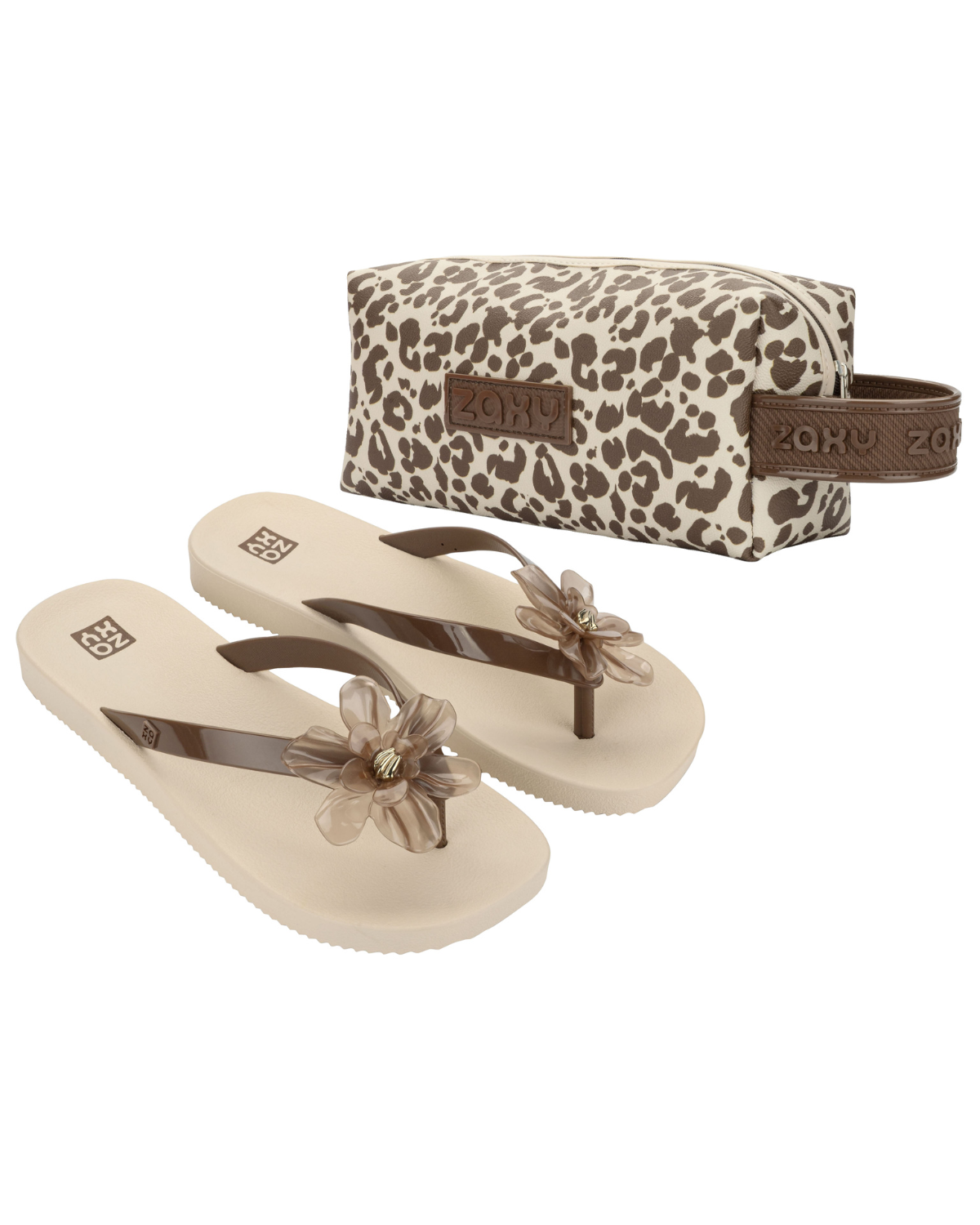 The Zaxy Summer Flip-Flop + Toiletry Bag combines practicality and style in a charming combo. The model gains a fashionable touch with a translucent maxi floral appliqué and glossy effect, which delicately reflects light. Inspired by three-dimensional flowers, the design combines classic romanticism with a modern and striking look. The toiletry bag accompanies the set with a coordinated print, in versions with a gradient effect or animal print, completing the look with personality